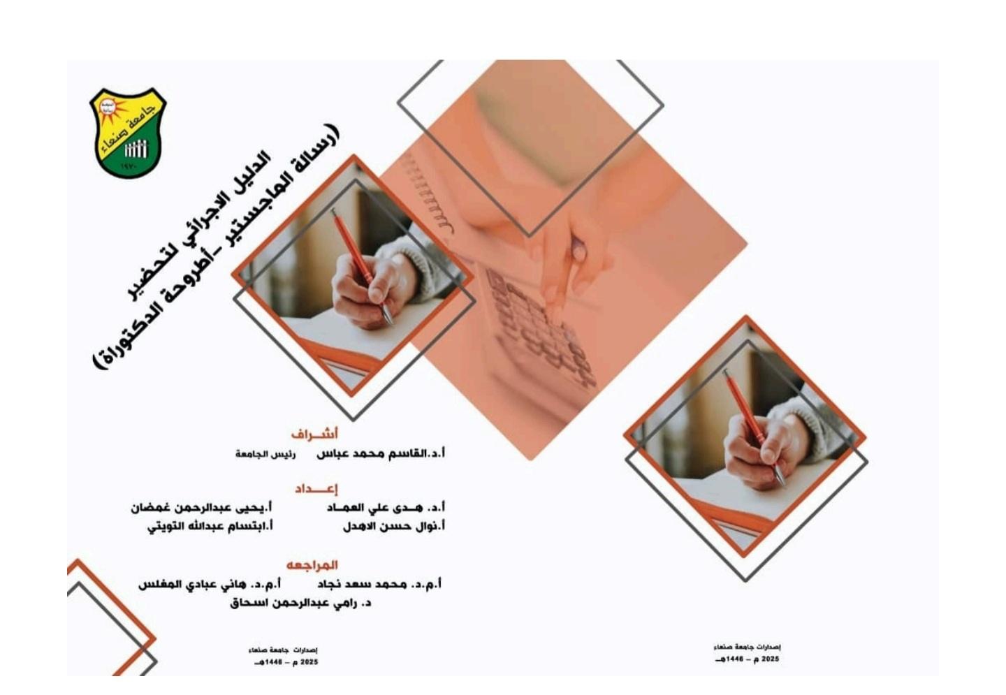 صدر عن نيابة رئاسة جامعة صنعاء للدراسات العليا والبحث العلمي مؤخرا عدداً من الآدلة الأجرائية والآليات المنظمة لتحضير الماجستير والدكتوراة