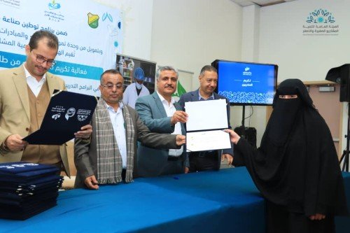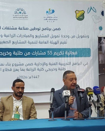 The Faculty of Agriculture, Food, and Environment at Sana’a University held a graduation ceremony today for participants of the Dairy Production Localization Program. This strategic initiative was implemented by the General Authority for Small and Micro Enterprise Development (GASMED) and funded by the Agricultural and Fisheries Projects and Initiatives Funding Unit in the Capital Secretariat (Sana’a), aiming to empower youth within the food industrial sector.