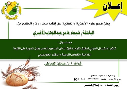 The Department of Food Sciences and Nutrition at the College of Agriculture, Food and Environment at Sana’a University held a public hearing session (seminar) on Wednesday morning, 29 Rajab 1446 AH, corresponding to January 29, 2025 AD, to discuss 2 for the research plan submitted by the student “Shaimaa Amer Abdul-Wahhab Al-Aghbari” to obtain a master’s degree.