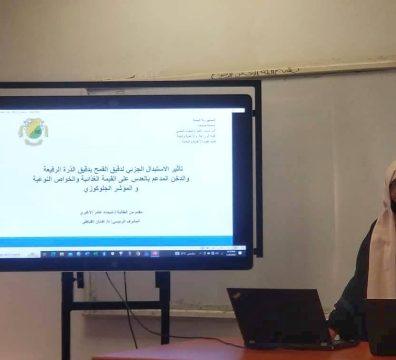 During the session, the student gave a comprehensive presentation of her research plan, covering the research title, research problem, importance of the research, research problem, research methodology, previous studies, in addition to the main and sub-objectives of the study, study sample, materials and work methods that she followed to implement her scientific study.
