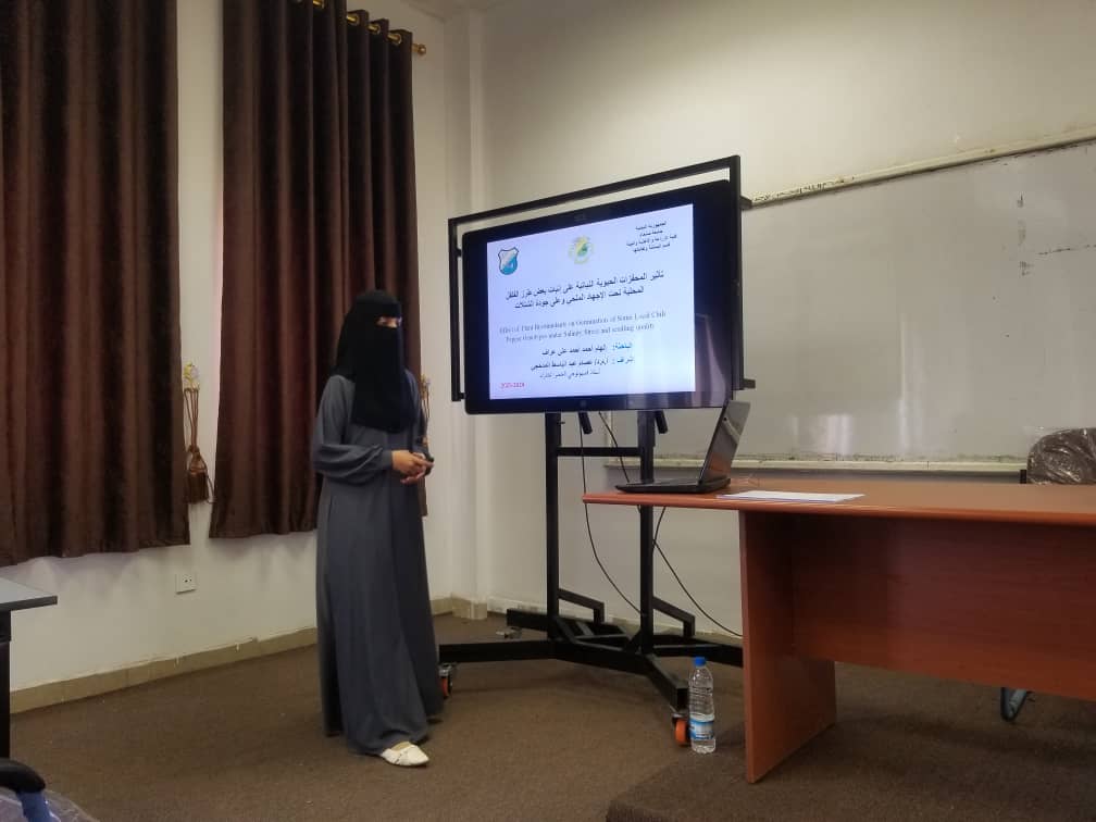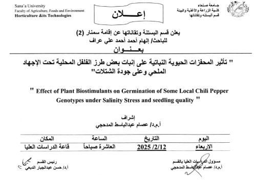 A hearing session (Seminar 2) was held for researcher ELHAM AHMED AHMED ALI ARRAF from the Department of Horticulture and its Technologies at the Faculty of Agriculture, Food, and Environment, Sana’a University,
