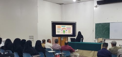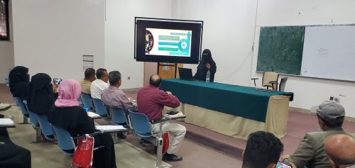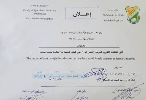 The Department of Food Science and Nutrition, Faculty of Agriculture, Food and Environment – Sana’a University held a public hearing (Seminar 1) this morning, Tuesday, Dhu al-Hijjah 29, 1446 Hijri, corresponding to June 24, 2025. The session was for the thesis plan, tools, materials, and expected key findings presented by Ms. Jehad Mohammed Saeed Shadad. Her thesis is titled: “The Impact of Rapid Weight Loss Nutritional Systems on the Health Status of Sana’a University Female Students.” During the session, the student presented a comprehensive overview of her thesis plan. She covered the research title, an extensive introduction, and a review of literature on obesity, a widespread issue in high-income countries, and its severe health complications, including mortality. The student also discussed the prevalence of obesity among populations in Arab countries, especially the affluent ones, and the significant role diet plays in its spread. Furthermore, she outlined the importance of her research, the research problem, methodology, main and sub-objectives, study sample size, study method, and the materials and work procedures she will follow to execute her scientific study. The presentation highlighted that many dietary systems are adopted for weight loss, but some have adverse effects, potentially endangering individuals, particularly those leading to rapid weight reduction. Others might lead to initial weight loss, only for the weight to rebound rapidly and significantly, making the problem worse than before. The student also detailed the methods and tools she will use to conduct her research and obtain the required data. This includes developing a questionnaire, presenting it to specialists in the department and faculty for review and approval, distributing it to a sample of female students at Sana’a University, and then conducting statistical analysis to obtain the desired findings. Members of the council and attendees discussed the research title, the research plan, the methods used in the study, and the expected findings from their scientific perspectives. They offered their necessary and essential observations and recommendations. This first session (Seminar 1) is a crucial requirement for the student to gain departmental approval for her research plan. Upon completion of the research steps and stages, there will be a second session (Seminar 2) to discuss the researcher’s key findings. The session was attended by the Head and faculty members of the department, several members of the Faculty’s Integrity Committee, and a number of postgraduate students, creating an academic atmosphere characterized by positive interaction and academic enrichment.