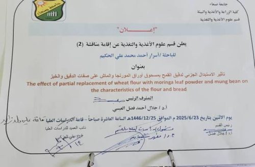 Department of Food Science and Nutrition, Faculty of Agriculture, Food and Environment – Sana’a University held a public session (Seminar 2) this morning, Monday, Dhu al-Hijjah 28, 1446 Hijri, corresponding to June 23, 2025. The session was for the thesis plan, tools, materials, and key findings presented by Ms. Asrar Ahmed Mohammed Al-Hakeem.