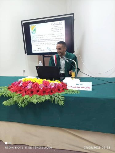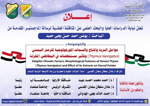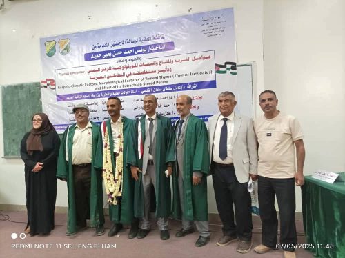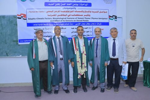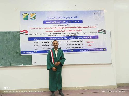 Mr. Younis Ahmed Hassan Yahya Hameed was awarded a Master’s degree for his thesis titled “Edaphic-Climatic Factors, Morphological Features of Yemeni Thyme (Thymus laevigatus) and Effect of its Extracts on Stored Potato,” which was submitted to the Department of Horticulture and Its Techniques, Faculty of Agriculture, Food, and Environment – Sana’a University. The MA defense was held on Saturday, Muharram 10, 1447 Hijri, corresponding to July 5, 2025.