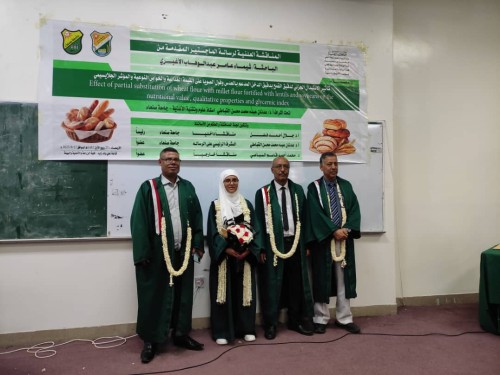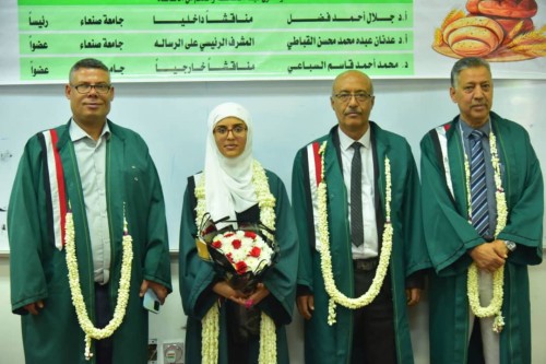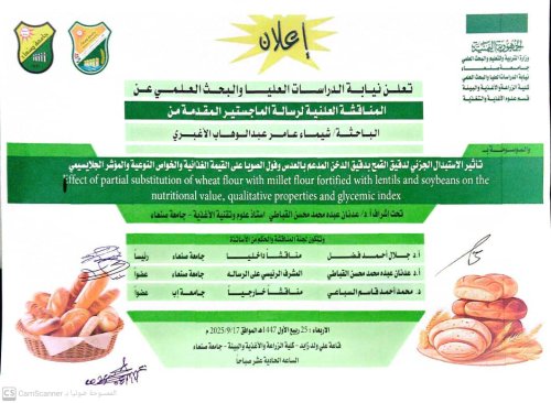 Ms. Shaima Amer Abdulwahab Al-Aghbari was awarded a Master’s degree in Food Science and Nutrition (Nutrition specialization) with an average of (Excellent) and a grade of (95%) for her thesis titled: Effect of Partial Substitution of Wheat Flour with Millet Flour Fortified with Lentils and Soybeans on Nutritional Value, Qualitative Properties, and Glycemic Index, which was submitted to the Department of Food Science and Nutrition, Faculty of Agriculture, Food, and Environment, Sana’a University. The MA defense was held on Wednesday, September 17, 2025.