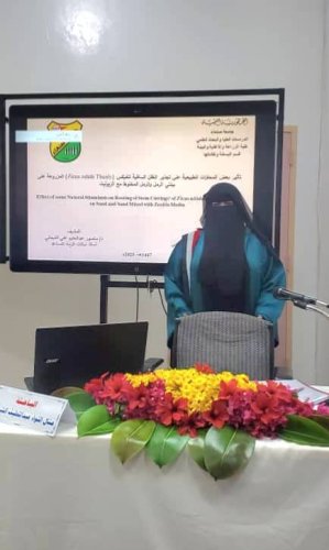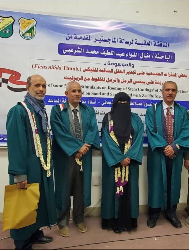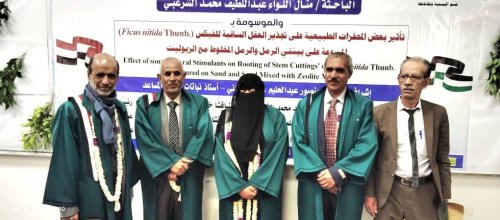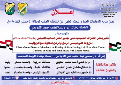 Ms. Manal Al-Liwa’ Abdullatif Al-Sharabi was awarded a Master’s Degree in Ornamentals with an average of Excellent and a grade of (93) for her thesis titled: The Effect of Some Natural Stimulators on the Rooting of Stem Cuttings of Ficus nitida Thunb Cultured on Sand and Sand Mixed with Zeolite Media, which was submitted to the Department of Horticulture and Its Technologies, Faculty of Agriculture, Food, and Environment – Sana’a University. The MA defense was held on Wednesday, December 24, 2025.