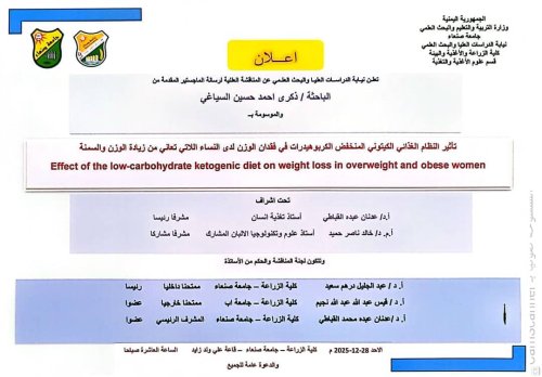 Ms. Dhikra Ahmed Hussein Al-Sayaghi was awarded a Master’s Degree in Food Science and Nutrition for her thesis titled: Effect of Low-Carbohydrate Ketogenic Diet on Weight Loss among Overweight and Obese Women, which was submitted to the Department of Food Science and Nutrition, Faculty of Agriculture, Food, and Environment – Sana’a University. The MA defense was held on Sunday, December 28, 2025.