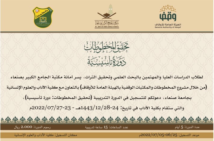 بالتعاون مع كلية الأداب والعلوم الإننسانية بجامعة صنعاء , دعوتكم للتسجيل في الدورة التدريبية (تحقيق المخطوطات : دورة تأسيسية).