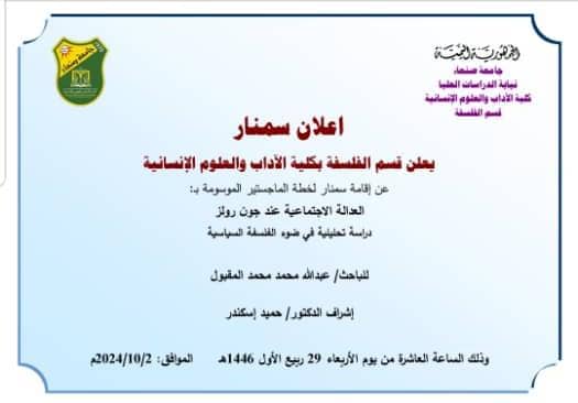 يعقد غدا الأربعاء قسم الفلسفة سمنار لخطة الماجستير المقدمة من الطالب عبد الله محمد محمد المقبول،