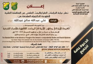 تعلن نيابة الدراسات العليا والبحث العلمي بجامعة صنعاء عن المناقشة العلنية لأطروحة الدكتوراه المقدمة من الباحث/ علي عبدالله صالح عبد الله، قسم الدراسات الإسلامية بكلية الآداب والعلوم الإنسانية ـ جامعة صنعاء