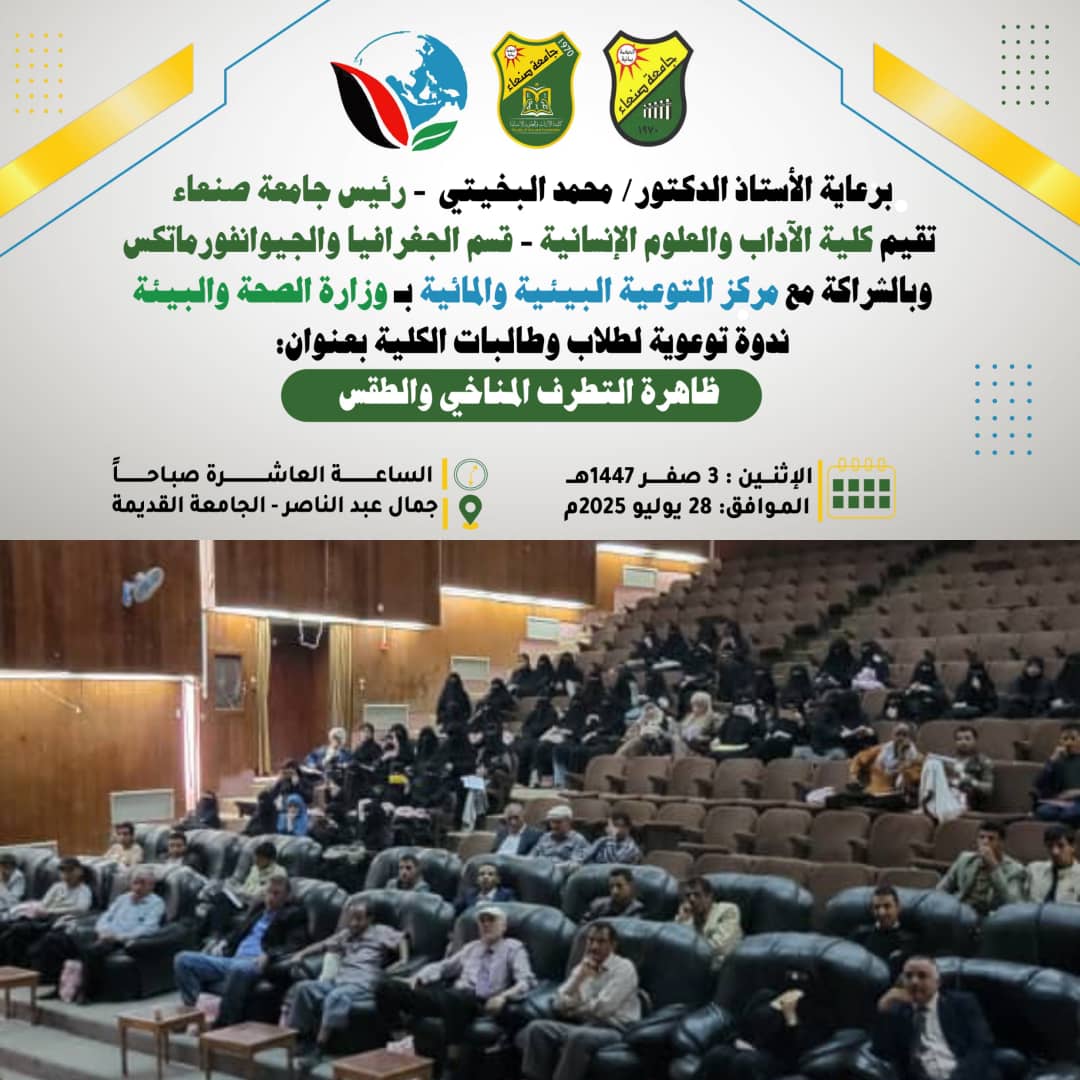 برعاية الأستاذ الدكتور محمد البخيتي، رئيس جامعة صنعاء، نظّمت كلية الآداب والعلوم الإنسانية قسم الجغرافيا والجيوانفورماتكس، وبالشراكة مع مركز التوعية البيئية والمائية بوزارة الصحة والبيئة، صباح اليوم ندوة علمية توعوية لطلاب وطالبات الكلية بعنوان: “ظاهرة التطرف المناخي والطقس”.