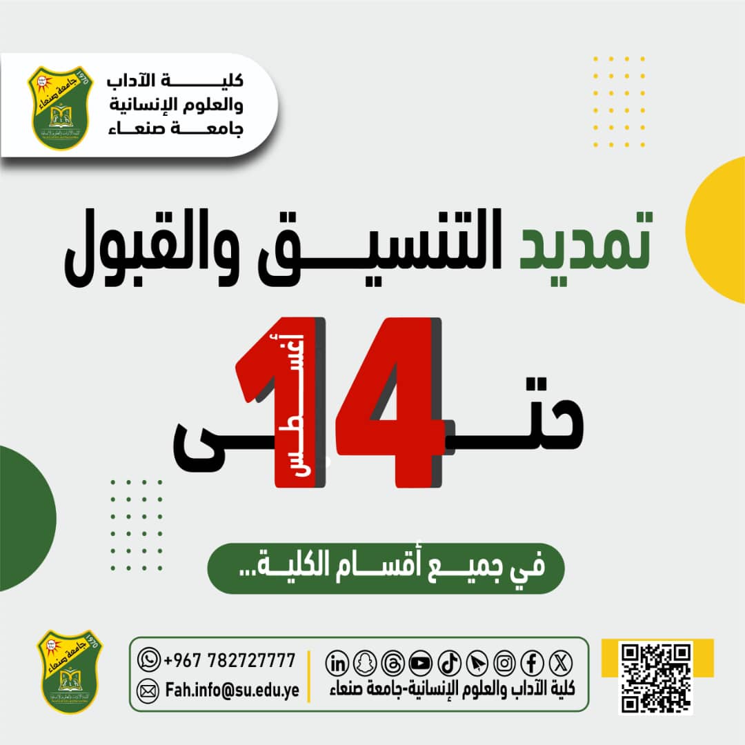 أعلنت كلية الآداب والعلوم الإنسانية عن تمديد فترة فتح باب التنسيق والقبول في الكلية، حتي تاريخ 14 أغسطس 2025م، نظام العام والموازي والنفقة الخاصة، للعام الجامعي 1447هـ/ 2026/2025م.