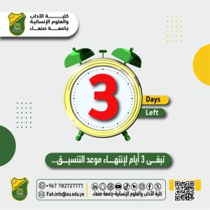 ثلاثة أيام فقط تفصلنا عن انتهاء فترة التنسيق والقبول في كلية الآداب والعلوم الإنسانية، وذلك حتى تاريخ 14 أغسطس 2025م، في جميع أقسام الكلية بنظامها العام والموازي والنفقة الخاصة للعام الجامعي 1447هـ/ 2025/2026م.