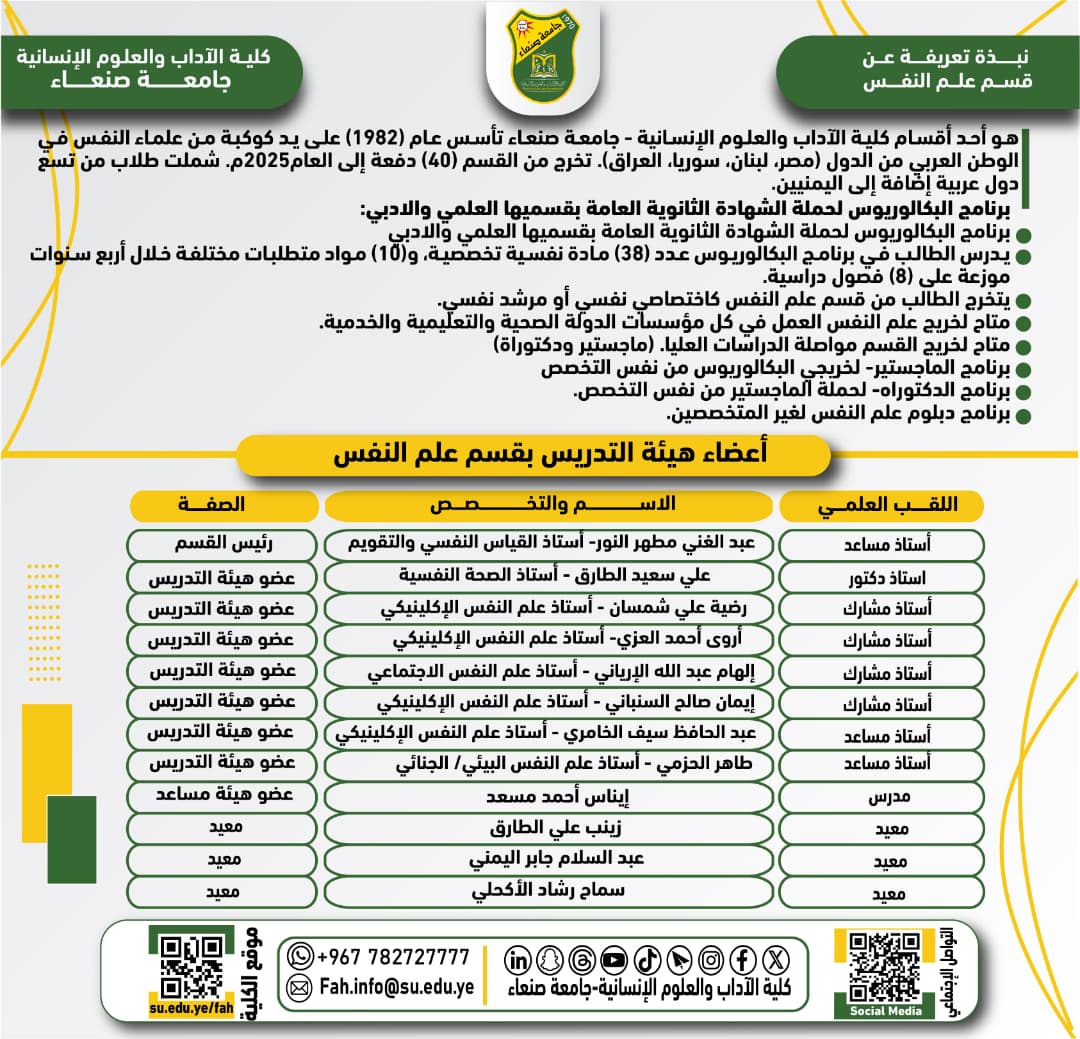 نبذة تعريفية عن قسم علم النفس بكلية الآداب والعلوم الإنسانية Posted by جامعة صنعاء كلية الآداب والعلوم الإنسانية التصنيفات الأخبار Date أغسطس 19, 2025 نبذة تعريفية عن قسم علم النفس بكلية الآداب والعلوم الإنسانية ولمزيد من عبر الرابط علم النفس جامعة صنعاء كلية الآداب والعلوم الإنسانية المقال السابق كلية الآداب والعلوم الإنسانية تحتفل بالمولد النبوي الشريف وتكرم أوائل الأقسام أغسطس 19, 2025 المقال التالي المناقشة العلنية لرسالة الماجستير المقدمة من الباحث/ محمد حسين عبد الله عيسى أغسطس 20, 2025 You may also like الدكتوراه للباحثة فائزة أحمد حسين الوادعي من قسم علم النفس – كلية الآداب والعلوم الإنسانية 31 مارس, 2026 الدكتوراه للباحث حافظ على محمد اليعري من قسم الجغرافيا والجيوانفورماتكس بكلية الآداب والعلوم الإنسانية 31 مارس, 2026 كلية الآداب والعلوم الإنسانية تعلن نتائج التظلمات للعام الجامعي 1447هـ (2025–2026م) 31 مارس, 2026