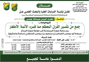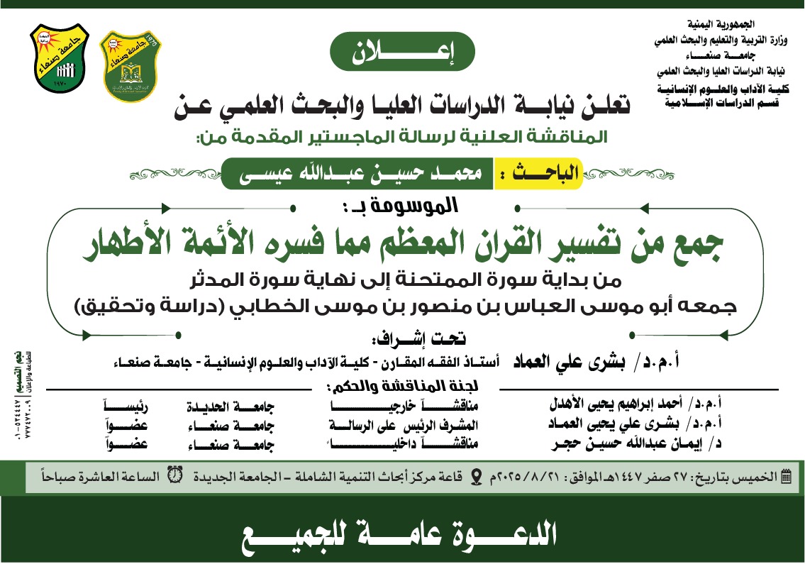 تعلن نيابة الدراسات العليا والبحث العلمي بجامعة صنعاء عن المناقشة العلنية لرسالة الماجستير المقدمة من الباحث/ محمد حسين عبد الله عيسى، قسم الدراسات الإسلامية بكلية الآداب والعلوم الإنسانية – جامعة صنعاء، عن رسالته الموسومة بـ: