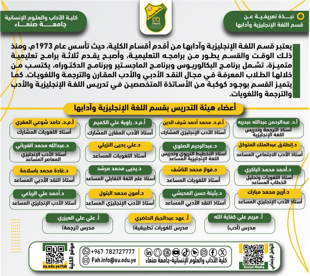 نبذة تعريفية عن قسم اللغة الإنجليزية وآدابها بكلية الآداب والعلوم الإنسانية Posted by كلية الآداب والعلوم الإنسانية جامعة صنعاء التصنيفات الأخبار Date أغسطس 22, 2025 نبذة تعريفية عن قسم اللغة الإنجليزية وآدابها بكلية الآداب والعلوم الإنسانية لمزيد من التفاصيل عبر الرابط في ذات السياق كلية الآداب والعلوم الإنسانية جامعة صنعاء المقال السابق الماجستير للباحث راشد محمد الهجن في اللغة الإنجليزية وآدابها بكلية الآداب والعلوم الإنسانية أغسطس 22, 2025 المقال التالي الدكتوراه للباحثة خيرية علي محمد في علم الاجتماع من كلية الآداب والعلوم الإنسانية أغسطس 22, 2025 You may also like المناقشة العلنية لرسالة الماجستير للباحث/قيس صالح على زاهر 25 فبراير, 2026 الدكتوراه للباحثة عالمة إبراهيم محمد الصلوي من قسم اللغة الإنجليزية بكلية الآداب والعلوم الإنسانية 25 فبراير, 2026 الدكتوراه للباحث أحمد منصر الضبيبي في تخصص اللغويات التطبيقية من قسم اللغة الإنجليزية وآدابها بكلية الآداب والعلوم الإنسانية 25 فبراير, 2026