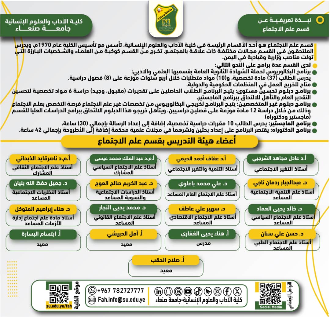 نبذة تعريفية عن قسم علم الإجتماع بكلية الآداب والعوم الانسانية Posted by كلية الآداب والعلوم الإنسانية جامعة صنعاء التصنيفات الأخبار Date أغسطس 24, 2025 نبذة تعريفية عن قسم علم الإجتماع بكلية الآداب والعوم الانسانية في ذات السياق كلية الآداب والعلوم الإنسانية جامعة صنعاء المقال السابق الدكتوراه للباحثة خيرية علي محمد في علم الاجتماع من كلية الآداب والعلوم الإنسانية أغسطس 24, 2025 المقال التالي نبذة تعريفية عن قسم التاريخ والعلاقات الدولية بكلية الآداب والعلوم الإنسانية أغسطس 24, 2025 You may also like المناقشة العلنية لرسالة الماجستير للباحث/قيس صالح على زاهر 25 فبراير, 2026 الدكتوراه للباحثة عالمة إبراهيم محمد الصلوي من قسم اللغة الإنجليزية بكلية الآداب والعلوم الإنسانية 25 فبراير, 2026 الدكتوراه للباحث أحمد منصر الضبيبي في تخصص اللغويات التطبيقية من قسم اللغة الإنجليزية وآدابها بكلية الآداب والعلوم الإنسانية 25 فبراير, 2026