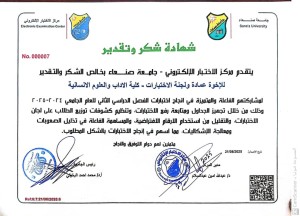 حصلت لجنة الاختبارات في كلية الآداب والعلوم الإنسانية – جامعة صنعاء على شهادة شكر وتقدير من مركز الاختبارات الإلكترونية بالجامعة ،شهادة موقعة من الأستاذ الدكتور محمد أحمد البخيتي – رئيس الجامعة، تقديراً لجهودها المتميزة في تطوير الأداء الأكاديمي وضمان جودة العملية التعليمية.