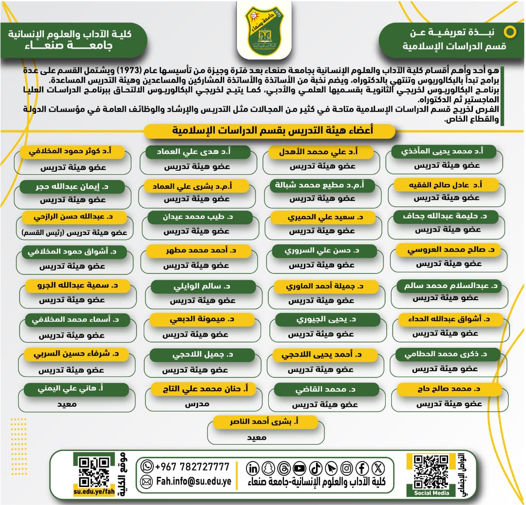 نبذة تعريفية عن قسم الدراسات الإسلامية بكلية الآداب والعلوم الإنسانية Posted by كلية الآداب والعلوم الإنسانية جامعة صنعاء التصنيفات الأخبار Date سبتمبر 2, 2025 نبذة تعريفية عن قسم الدراسات الإسلامية بكلية الآداب والعلوم الإنسانية في ذات السياق كلية الآداب والعلوم الإنسانية جامعة صنعاء المقال السابق نبذة تعريفية عن قسم الفلسفة بكلية الآداب والعلوم الإنسانية سبتمبر 2, 2025 المقال التالي فريق كلية الآداب والعلوم الإنسانية يحصد المركز الثاني في بطولة الكرة الطائرة بجامعة صنعاء سبتمبر 3, 2025 You may also like المناقشة العلنية لرسالة الماجستير للباحث/قيس صالح على زاهر 25 فبراير, 2026 الدكتوراه للباحثة عالمة إبراهيم محمد الصلوي من قسم اللغة الإنجليزية بكلية الآداب والعلوم الإنسانية 25 فبراير, 2026 الدكتوراه للباحث أحمد منصر الضبيبي في تخصص اللغويات التطبيقية من قسم اللغة الإنجليزية وآدابها بكلية الآداب والعلوم الإنسانية 25 فبراير, 2026