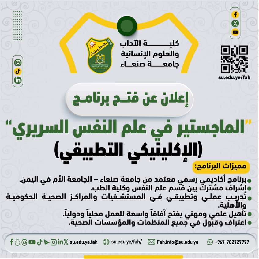 استمرار التسجيل في ماجستير علم النفس السريري ” الإكلينيكي التطبيقي” Posted by كلية الآداب والعلوم الإنسانية جامعة صنعاء التصنيفات الأخبار Date سبتمبر 23, 2025 استمرار التسجيل في ماجستير علم النفس السريري ” الإكلينيكي التطبيقي” في ذات السياق كلية الآداب والعلوم الإنسانية جامعة صنعاء المقال السابق تمديد فتح باب التنسيق والقبول في برامج الدراسات العليا سبتمبر 23, 2025 المقال التالي كشف توزيع الطلاب والطالبات لإختبارات المواد المؤتمتة الفصل الدراسي الأول العام الجامعي 1447هـ 2025-2026م ليوم السبت الموافق 27/ 9 / 2025 م لمستوى الأول والمستوى الثالث سبتمبر 24, 2025 You may also like المناقشة العلنية لرسالة الماجستير للباحث/قيس صالح على زاهر 25 فبراير, 2026 الدكتوراه للباحثة عالمة إبراهيم محمد الصلوي من قسم اللغة الإنجليزية بكلية الآداب والعلوم الإنسانية 25 فبراير, 2026 الدكتوراه للباحث أحمد منصر الضبيبي في تخصص اللغويات التطبيقية من قسم اللغة الإنجليزية وآدابها بكلية الآداب والعلوم الإنسانية 25 فبراير, 2026