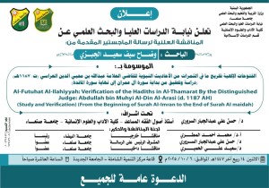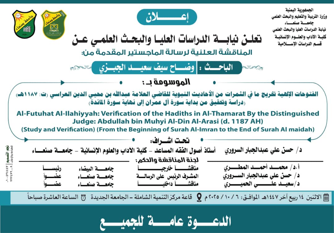 تعلن نيابة الدراسات العليا والبحث العلمي بجامعة صنعاء عن المناقشة العلنية لرسالة الماجستير المقدمة من الباحث: وضاح سيف سعيد الجبزي- قسم الدارسات الإسلامية – بكلية الآداب والعلوم الإنسانية عن رسالته الموسومة ب الفتوحات الإلهية تخريج ما في الثمرات من الأحاديث النبوية للقاضي العلامة عبدالله بن محيي الدين العراسي (ت: 1187ه)