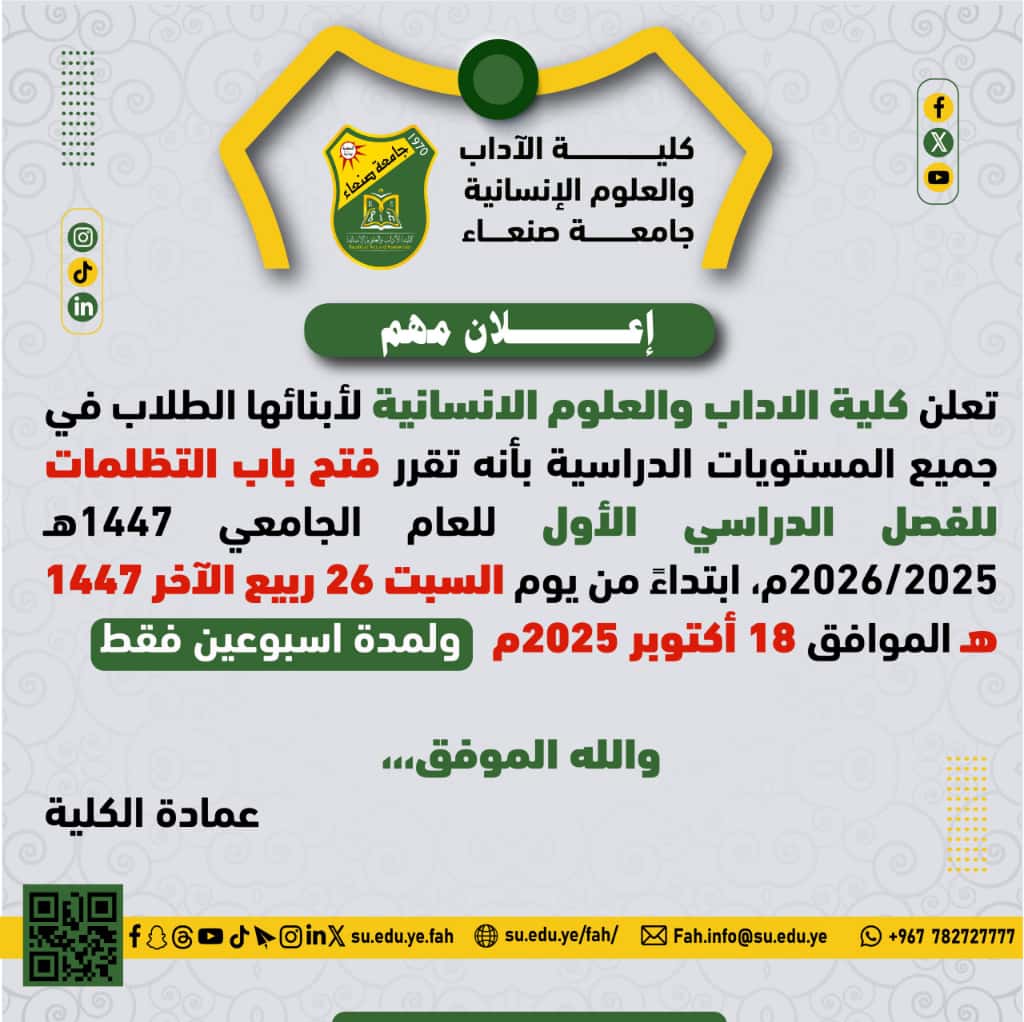 كلية الآداب والعلوم الإنسانية تعلن عن فتح باب التظلمات للفصل الدراسي الأول Posted by كلية الآداب والعلوم الإنسانية جامعة صنعاء التصنيفات الأخبار Date أكتوبر 12, 2025 تعلن كلية الآداب والعلوم الإنسانية عن فتح باب التظلمات للفصل الدراسي الأول من العام الجامعي 1447 هـ، 2025/ 2026 م ابتداء من يوم السبت 26 ربيع الآخر 1448 هـ الموافق 18 أكتوبر 2025م ، ولمدة أسبوعين من تاريخ الإعلان. في ذات السياق كلية الآداب والعلوم الإنسانية جامعة صنعاء المقال السابق الماجستير للباحث عبدالله حسين مجعار من قسم الدراسات الإسلامية بكلية الآداب والعلوم الإنسانية أكتوبر 12, 2025 المقال التالي كلية الآداب والعلوم الإنسانية تعقد اجتماعها الرابع للعام الجامعي 1447هـ – 2025 /2026 م أكتوبر 13, 2025 You may also like قسم الفلسفة بكلية الآداب والعلوم الإنسانية في جامعة صنعاء ، يناقش خطة رسالة الماجستير المقدمة من الباحث هاشم عبدالله السدمي 23 فبراير, 2026 قسم الفلسفة بكلية الآداب والعلوم الإنسانية في جامعة صنعاء يناقش خطة رسالة الماجستير المقدمة من الباحثة ياسمين حسين الحرازي 23 فبراير, 2026 الدكتوراه للباحث عمر باعلوي في الدراسات الإسلامية (تخصص حديث وعلومه) من كلية الآداب والعلوم الإنسانية 21 فبراير, 2026