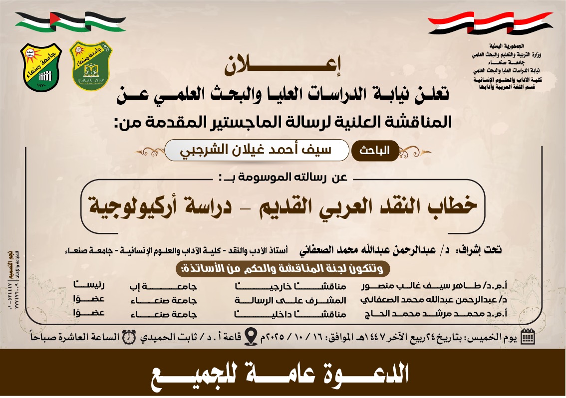 تعلن نيابة الدراسات العليا والبحث العلمي بجامعة صنعاء عن المناقشة العلنية لرسالة الماجستير المقدمة من الباحث سيف أحمد غيلان الشرجبي، من قسم اللغة العربية – كلية الآداب والعلوم الإنسانية، بعنوان: