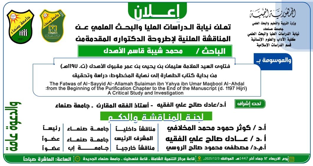 ومن المقرر أن تعقد المناقشة يوم الأربعاء الموافق 12 جمادى الآخرة 1447هـ 3 ديسمبر 2025م وذلك في قاعة مركز التنمية الشاملة – قاعة فلسطين (النوع الاجتماعي سابقاً) بجامعة صنعاء الجديدة عند الساعة العاشرة صباحاً.