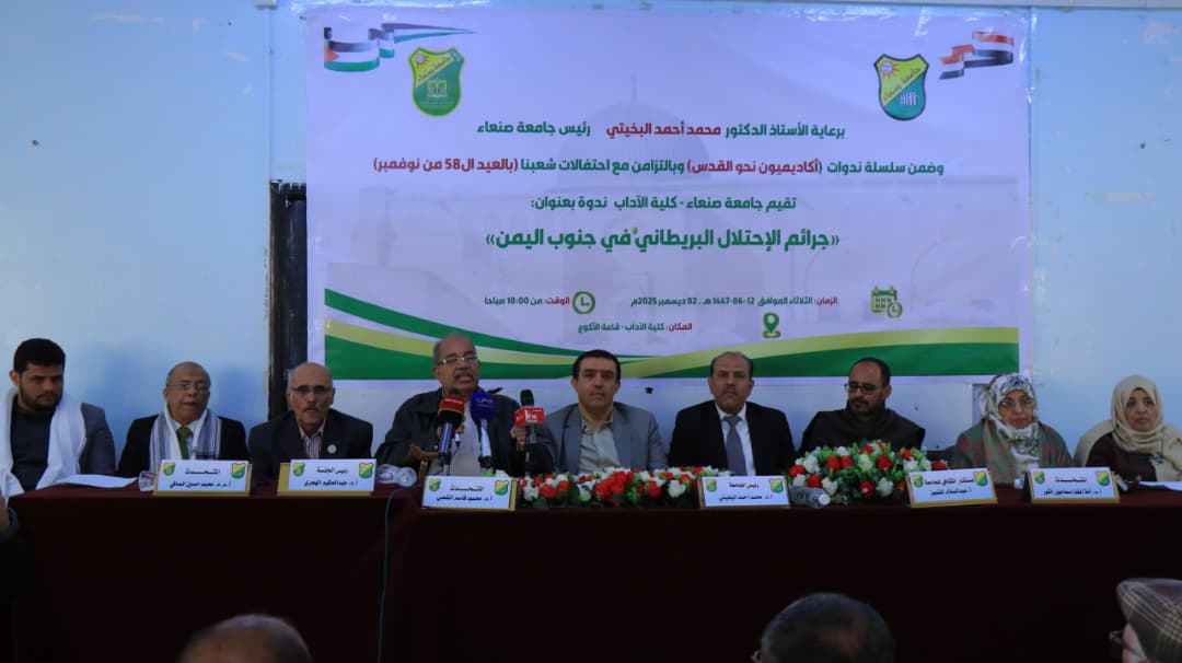 نظّمت جامعة صنعاء اليوم بكلية الآداب والعلوم الإنسانية ندوة علمية بعنوان “جرائم الاحتلال البريطاني في جنوب اليمن”، ضمن برنامج “أكاديميون نحو القدس”، تزامنًا مع احتفالات الشعب اليمني بذكرى الجلاء ورحيل آخر جندي بريطاني من جنوب الوطن في 30 نوفمبر 1967م.
