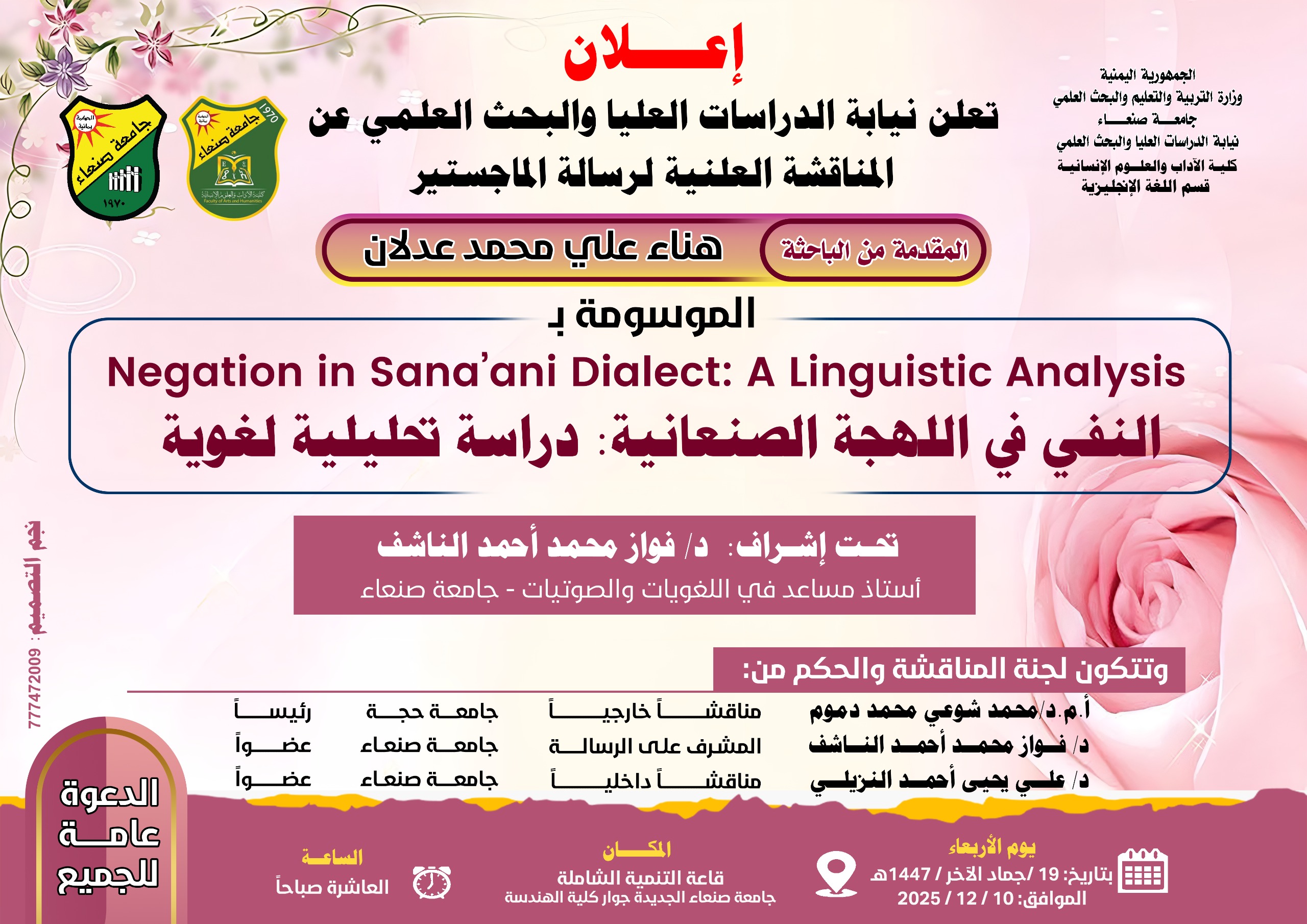 تُعلن نيابة الدراسات العليا والبحث العلمي بجامعة صنعاء عن عقد المناقشة العلنية لرسالة الماجستير بقسم اللغة الإنجليزية – كلية الآداب والعلوم الإنسانية، الموسومة بعنوان: