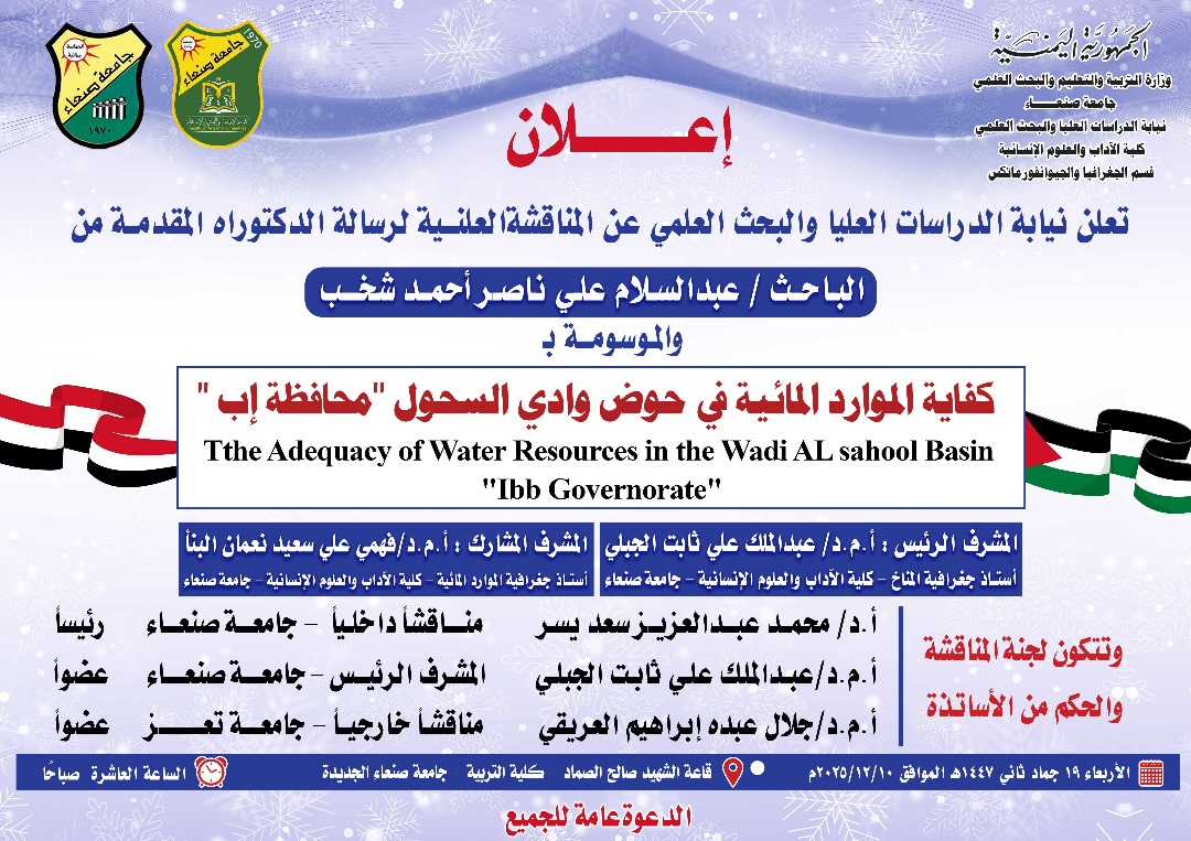 تعلن نيابة الدراسات العليا والبحث العلمي بجامعة صنعاء عن عقد المناقشة العلنية لأطروحة الدكتوراه المقدمة من الباحث عبد السلام علي ناصر أحمد شخب، قسم الجغرافيا والجيوانفورماتكس بكلية الآداب والعلوم الإنسانية، حول أطروحته الموسومة بـ: