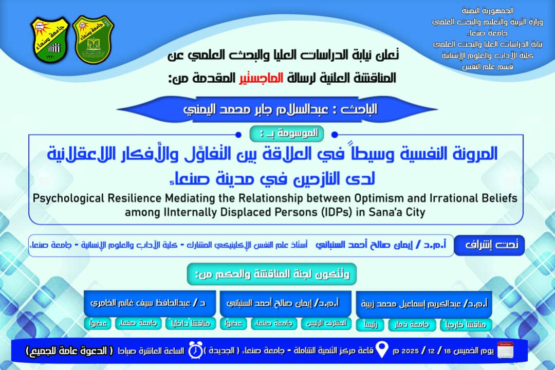 تعلن نيابة الدراسات العليا والبحث العلمي بجامعة صنعاء عن عقد المناقشة العلنية لرسالة الماجستير المقدمة من الباحث عبد السلام جابر محمد اليمني، قسم علم النفس بكلية الآداب والعلوم الإنسانية، وذلك حول رسالته الموسومة بـ: