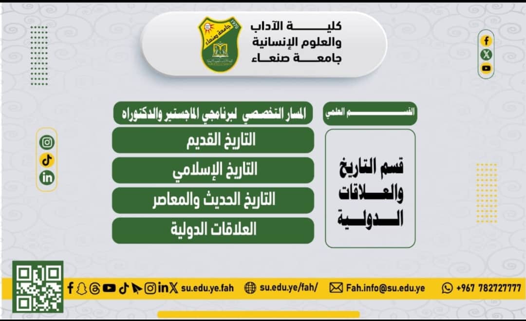 أقَرَّ مجلس جامعة صنعاء في اجتماعه السادس المنعقد بتاريخ 29 نوفمبر 2025م اعتماد مسارات برامج الدراسات العليا في قسم التاريخ والعلاقات الدولية بكلية الآداب والعلوم الإنسانية، وذلك في إطار جهود الجامعة المستمرة لتطوير برامجها الأكاديمية وتعزيز البحث العلمي في مجالات التاريخ والدراسات السياسية.