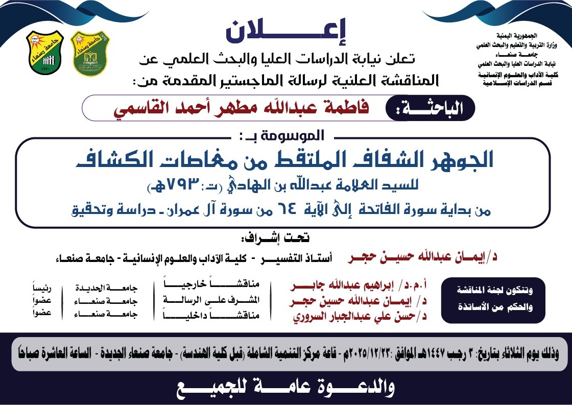 تعلن نيابة الدراسات العليا والبحث العلمي بجامعة صنعاء عن المناقشة العلنية لرسالة الماجستير المقدمة من الباحثة: فاطمة عبدالله مطهر أحمد القاسمي
