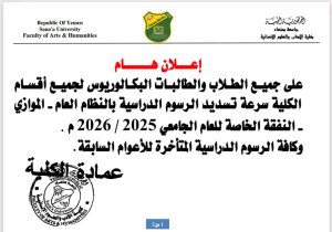 تُعلن عمادة كلية الآداب والعلوم الإنسانية – جامعة صنعاء، لجميع الطلبة الذين لم يستكملوا سداد الرسوم المقررة عليهم، سواءً كانت رسومًا دراسية أو أي رسوم أخرى، ضرورة الإسراع في سدادها قبل بدء اختبارات الفصل الدراسي الثاني للعام الجامعي 1447هـ – 2025/2026م.
