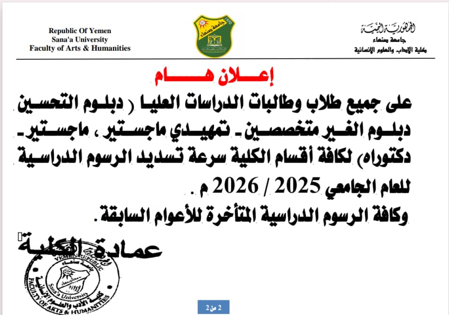 تُعلن عمادة كلية الآداب والعلوم الإنسانية – جامعة صنعاء، لجميع الطلبة الذين لم يستكملوا سداد الرسوم المقررة عليهم، ضرورة الإسراع بسدادها قبل بدء الفصل الدراسي الثاني للعام الجامعي 1447هـ – 2025/2026م.