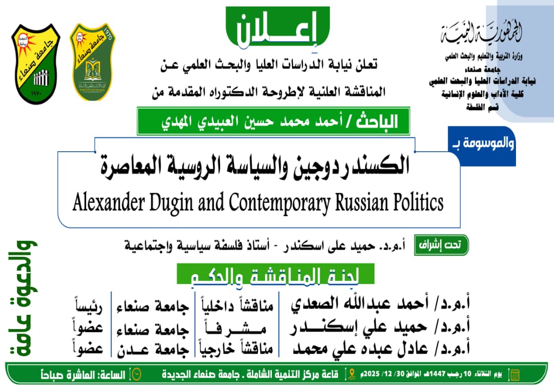 تعلن نيابة الدراسات العليا والبحث العلمي بجامعة صنعاء عن المناقشة العلنية لرسالة الماجستير المقدمة من الباحث: أحمد محمد حسين العبيدي المهدي – قسم الفلسفة – بكلية الآداب والعلوم الإنسانية عن رسالته الموسومةب:(ألكسندر دوجين والسياسة الروسية المعاصرة)