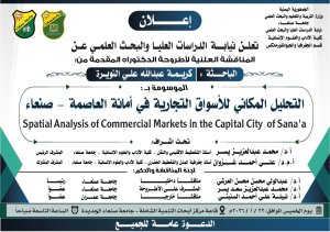 وتحمل الأطروحة عنوان:التحليل المكاني للأسواق التجارية في أمانة العاصمة – صنعاء .