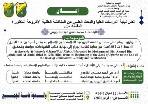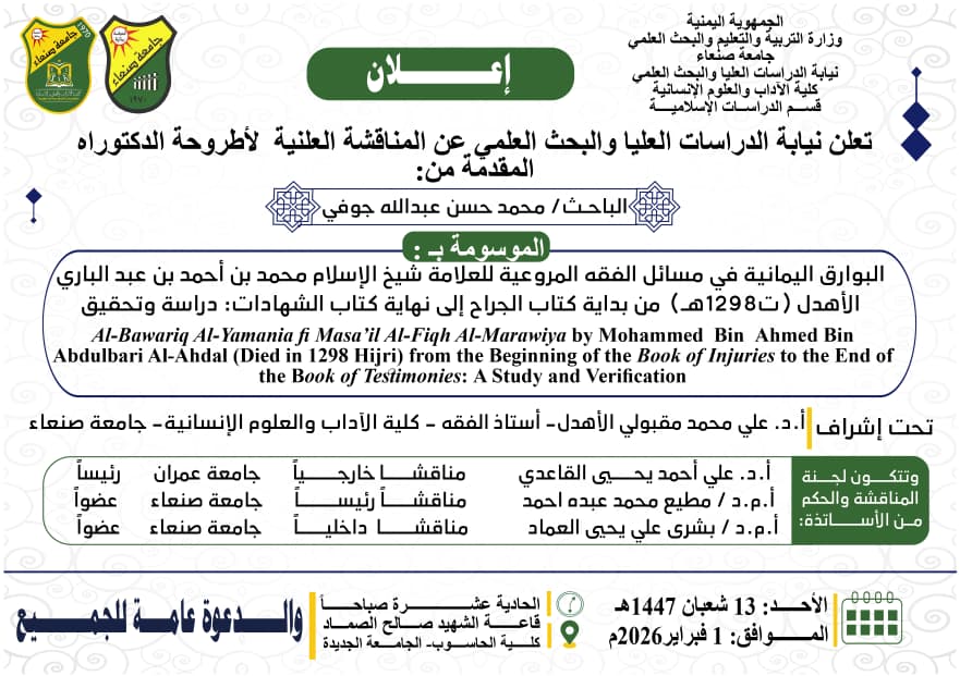 أعلنت نيابة الدراسات العليا والبحث العلمي بجامعة صنعاء عن إقامة المناقشة العلنية لأطروحة الدكتوراه المقدّمة من الباحث/ محمد حسن عبدالله جوفي، في قسم الدراسات الإسلامية بكلية الآداب والعلوم الإنسانية.