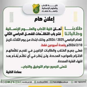 تُعلن كلية الآداب والعلوم الإنسانية لأبنائها الطلبة أنه قد تقرر فتح باب التظلّمات للفصل الدراسي الثاني للعام الجامعي 2025 / 2026م، وذلك ابتداءً من يوم الثلاثاء تاريخ 2026/2/10 ولمدة أسبوعين فقط.