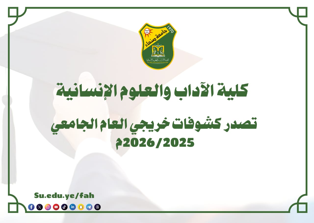 أعلنت كلية الآداب والعلوم الإنسانية – جامعة صنعاء عن إصدار كشوفات خريجيها للعام الجامعي 2025/2026م، وذلك لكافة الأقسام العلمية في الكلية، بعد استكمال إجراءات المراجعة والتدقيق الأكاديمي والإداري.