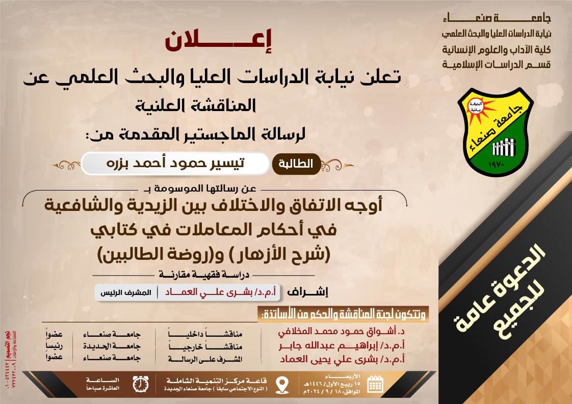 🔴إعلان🔴 تُعلن نيابة الدراسات العليا والبحث العلمي عن المناقشة العلنية لرسالة الماجستير المقدمة من الطالبة/تيسير حمود أحمد بزره الموسومة بـ : (أوجه الاتفاق والاختلاف بين الزيدية والشافعية في أحكام المعاملات في كتابي شرح الأزهار وروضة الطالبين) “دراسة فقهية مقارن” إشراف …
