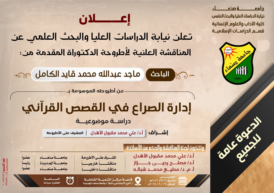 🔴إعلان🔴 تُعلن نيابة الدراسات العليا والبحث العلمي عن المناقشة العلنية لأطروحة الدكتوراة المقدمة من الباحث /ماجد عبدالله محمد قايد الكامل عن أطروحته الموسومة بـ: إدارة الصراع في القصص القرآني (دراسة موضوعية) إشراف : أ.د/ علي محمد مقبول الأهدل المشرف على …