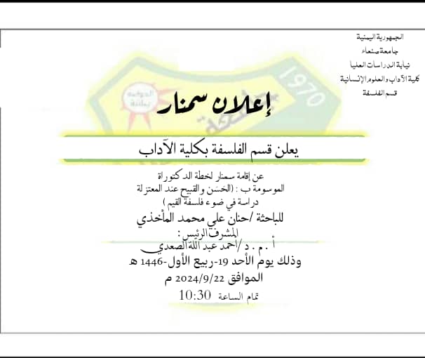 يعلن قسم الفلسفة بكلية الآداب والعلوم الإنسانية بجامعة صنعاء، عن إقامة سمنار لخطة أطروحة الدكتوراة الموسومة بعنوان :(( الحسن والقبيح عند المعتزلة دراسة في ضوء فلسفة القيم.)) للباحثة/حنان علي محمد المأخذي المشرف الرئيس:أ.م.د/أحمد عبدالله الصعدي . وذلك يوم الأحد ١٩ربيع أول …