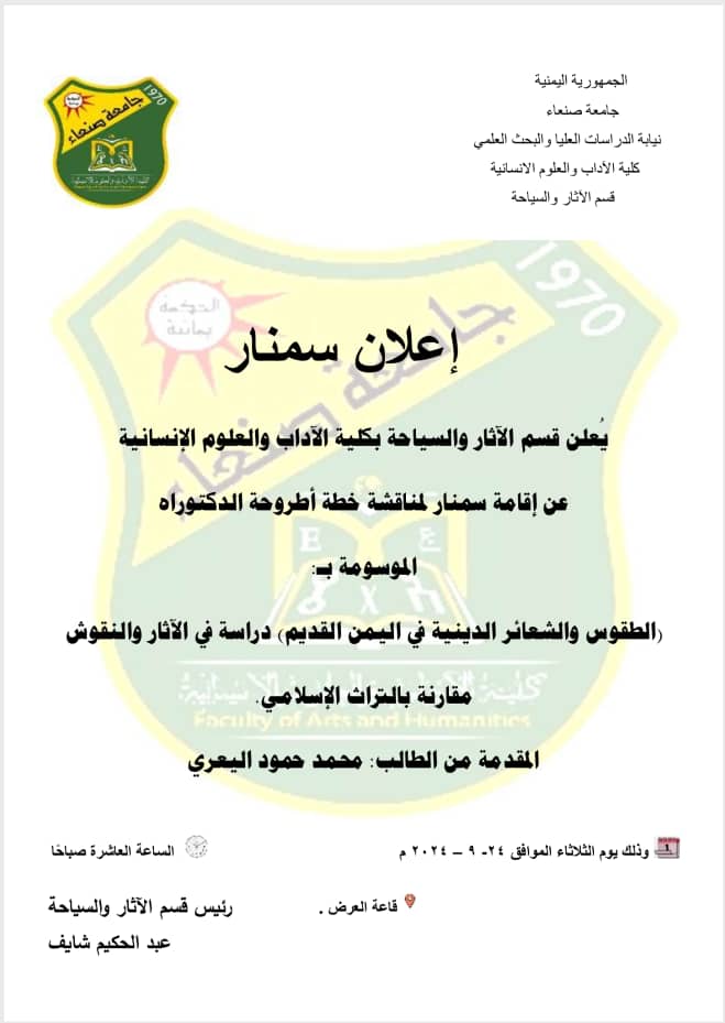 إعلان سمنار يُعلن قسم الآثار والسياحة بكلية الآداب والعلوم الإنسانية عن إقامة سمنار لمناقشة خطة أطروحة الدكتوراة الموسومة ب: (الطقوس والشعائر الدينية في اليمن القديم) دراسة في الآثار والنقوش مقارنة بالتراث الإسلامي، المقدمة من الطالب : محمد حمود اليعري. وذلك …