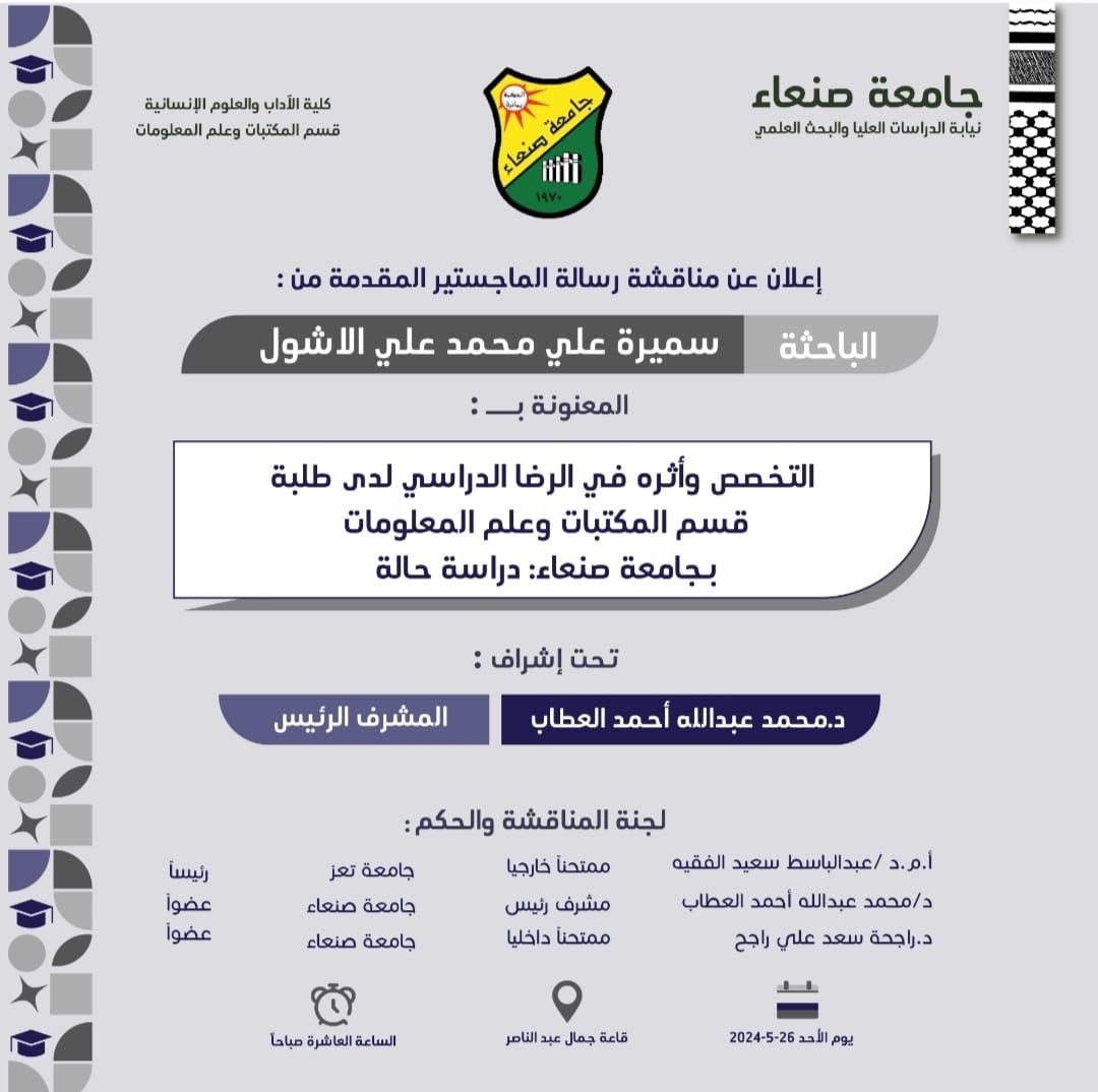 يعلن قسم المكتبات وعلم المعلومات عن المناقشة العلنية لرسالة الماجستير للطالبة/ سميرة علي محمد علي الأشول، تحت اشراف: د. محمد عبدالله أحمد العطاب، والموسومة بــ(التخصص وأثره في الرضا الدراسي لدى طلبة قسم المكتبات وعلم المعلومات بجامعة صنعاء: دراسة حالة)، وذلك …