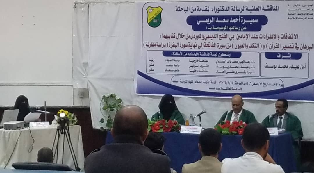 نالت الباحثة/ سميرة أحمد سعد الريمي الدكتوراه في قسم الدراسات الإسلامية التخصصية تفسير وعلوم القرآن كلية الآداب والعلوم الإنسانية في صنعاء عن أطروحتها الموسومة بـ : “توافقات والانفرادات عند الإمامين أبي الفتح الديلمي والماوردي من خلال كتابيهما “البرهان في تفسير …
