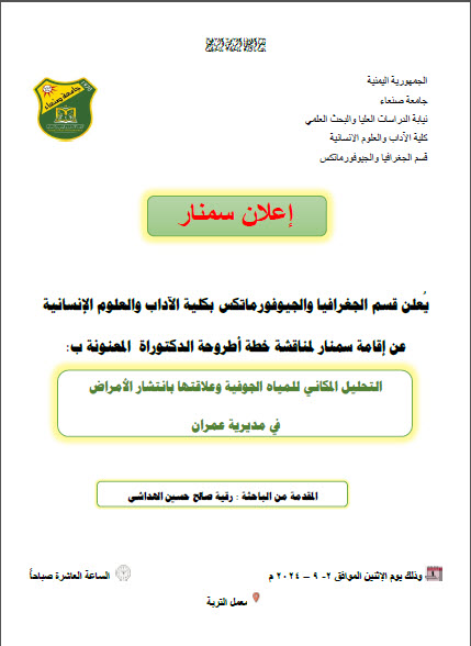 يُعلن قسم الجغرافيا والجيوفورماتكس بكلية الآداب والعلوم الإنسانية عن إقامة سمينار لمناقشة خطط أطروحات الدكتوراه المقدمة من الطلاب التالية أسماؤهم: 1. الباحثة: أمل حسن عبدالرحمن حميد الدين، وخطة بحثها الموسومة بـ: “تأثير التغير المناخي على راحة الإنسان وصحته في مدينة …