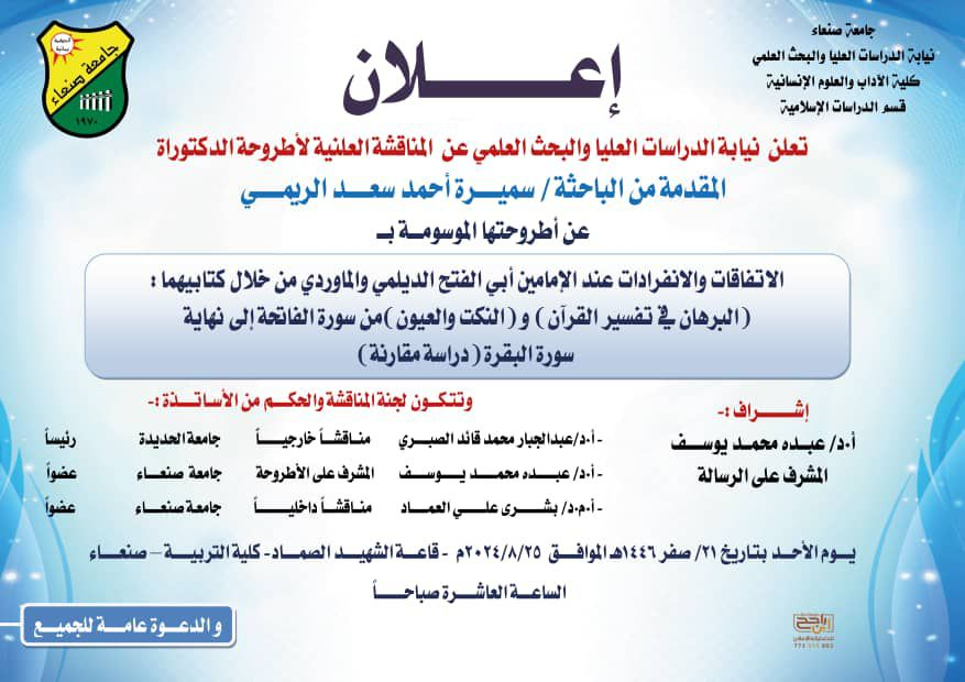 تعلن كلية الآداب والعلوم الانسانية بجامعة صنعاء عن المناقشة العلنية لأطروحة الدكتورأة المقدمة من الباحثة /سميرة أحمد سعد الريمي عن رسالته الموسومة بــ “الاتفاقات والانفرادات عند الإمامين أبي الفتح الديلمي والماوري من خلال كتابيهما:(البرهان في تفسير القران)و (النكت والعيون) من …