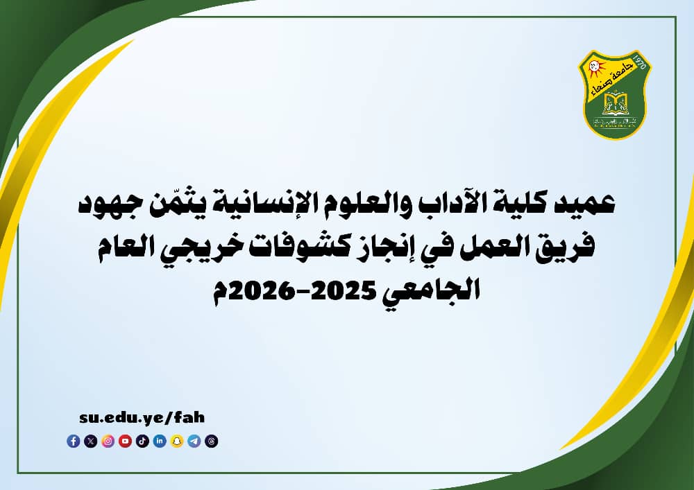 أعلنت كلية الآداب والعلوم الإنسانية – جامعة صنعاء عن إصدار كشوفات خريجيها للعام الجامعي 2025/2026م، وذلك لكافة الأقسام العلمية في الكلية، بعد استكمال إجراءات المراجعة والتدقيق الأكاديمي والإداري. وجاء إصدار الكشوفات بقيادة عميد الكلية الأستاذ الدكتور عبدالملك محمد عيسى، وضمن …